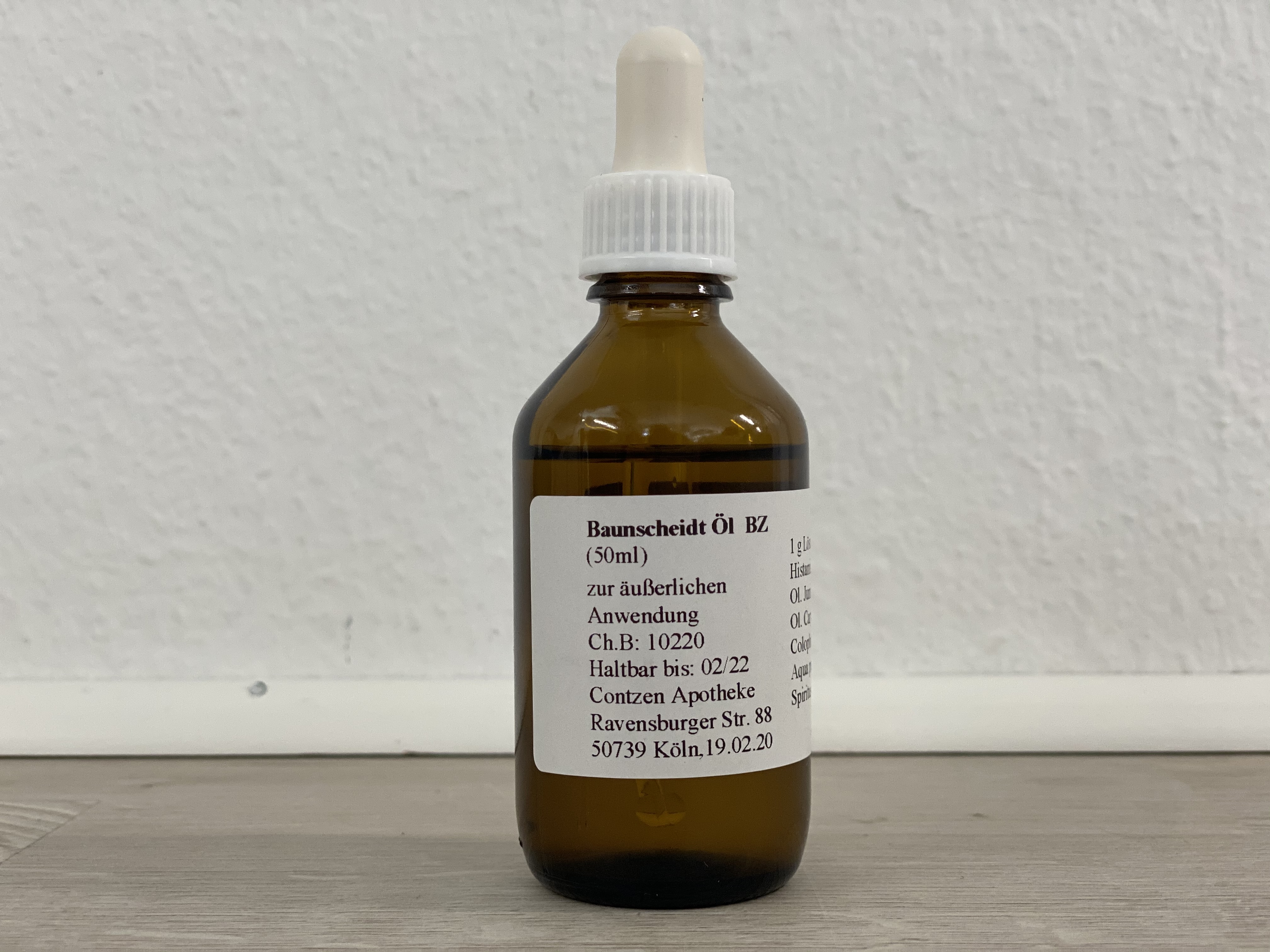 Bei der Baunscheidt-Öl Herstellung sind zwei Baunscheidt-Öle gängig und werden je nach Hautbeschaffenheit und Stärke der Beschwerden eingesetzt.